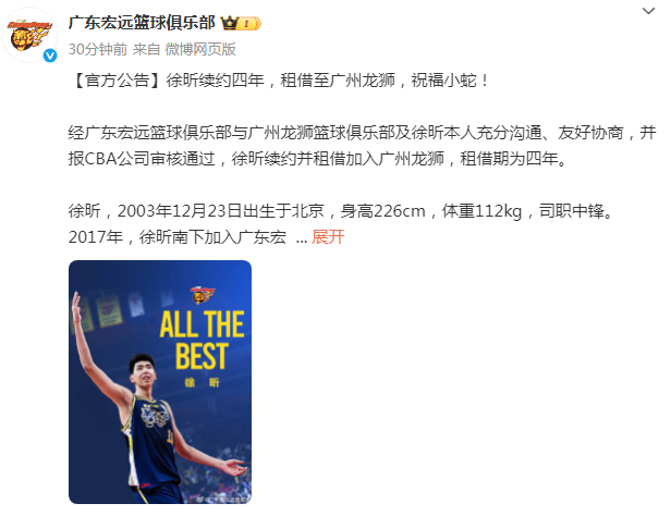 广东男篮官方公告写道:“经广东宏远篮球俱乐部与广州龙狮篮球俱乐部,及徐昕本人充分沟通、友好协商,并报CBA公司审核通过,徐昕续约并租借加入广州龙狮,租借期为四年。”