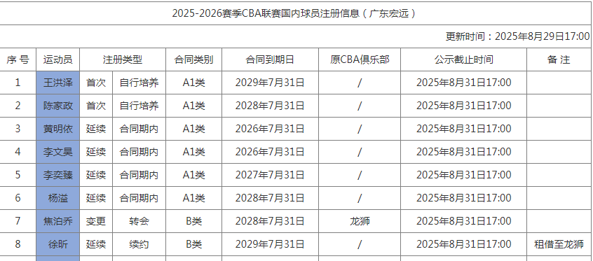 徐昕今夏已经结束与广东男篮的4年新秀A1类合同,根据CBA规则他只能签约B类保护合同。根据CBA官网的注册信息显示,徐昕是续约4年B类合同,将在2029年7月31日合同到期。